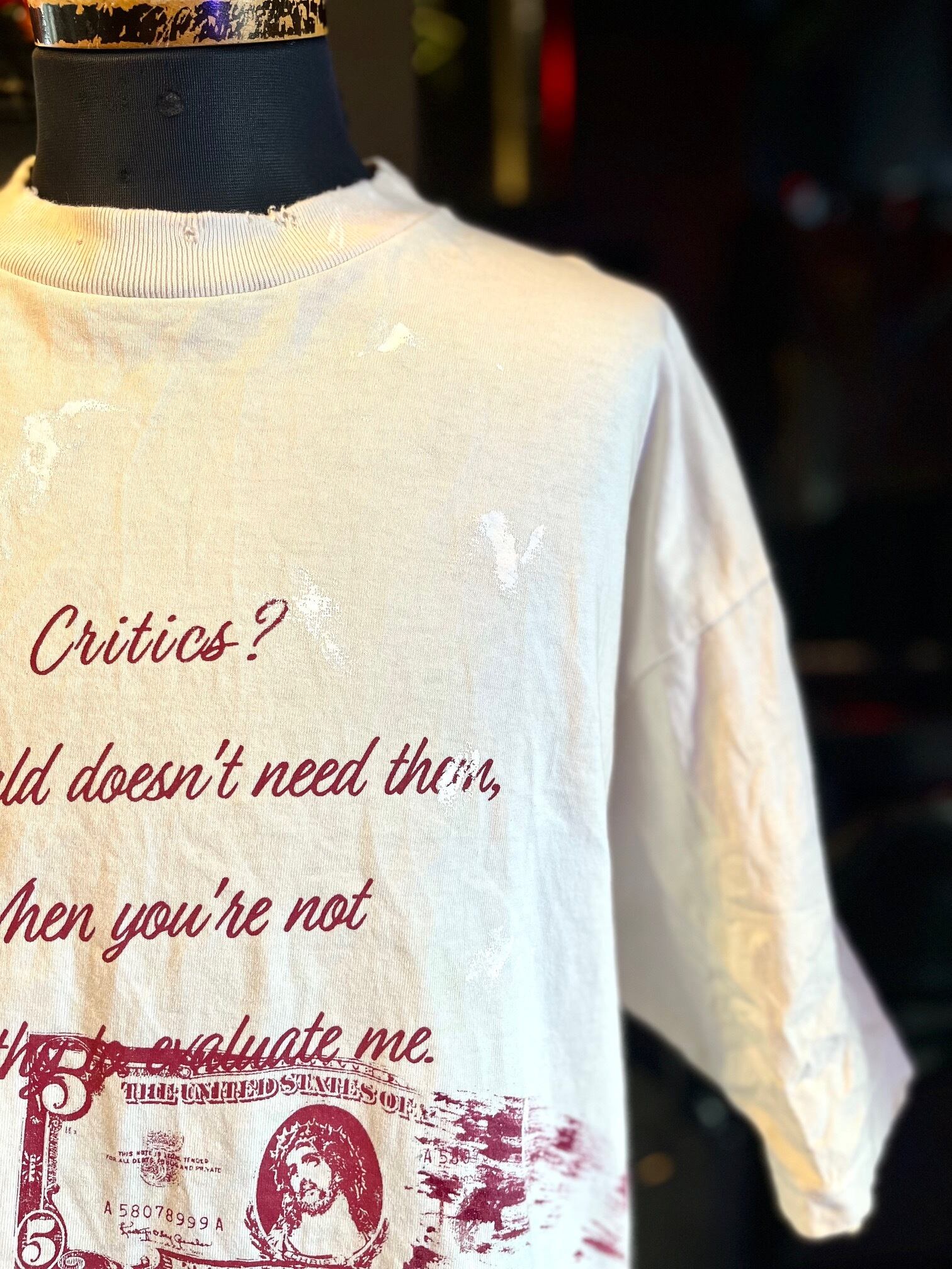 ジーザスを模したドル札デザインに、「この世に評論家なんていらない。だってあなた達に私は評価なんて出来ないから」というメッセージがプリントされている。