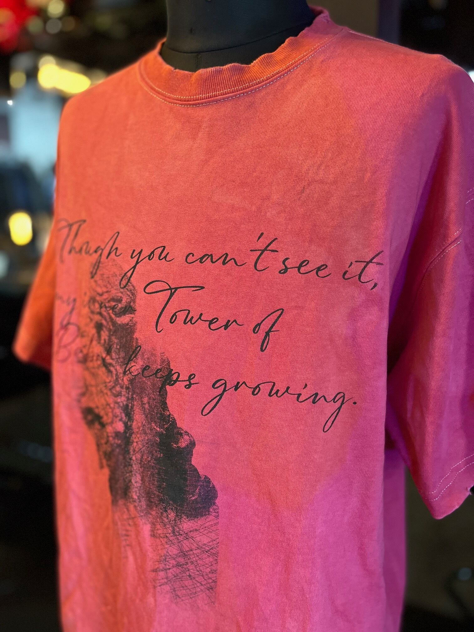 彫刻がモチーフのグラフィックに、「あなたには見えなくても、私の中のBABELの塔は作り続けている。」というメッセージがプリントされている。