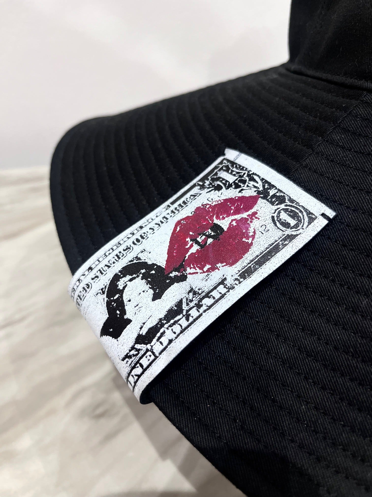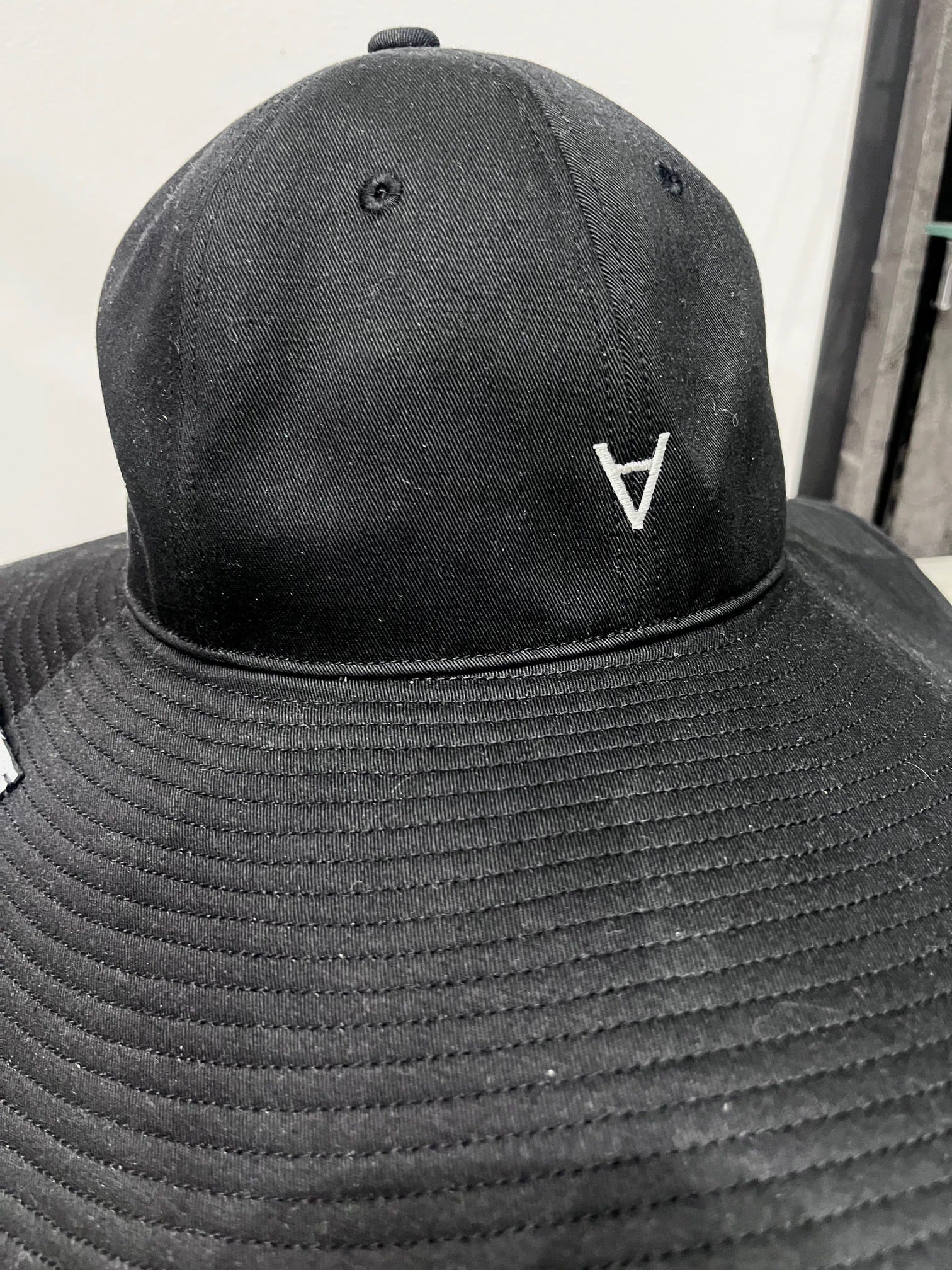ブリムに手刷りプリントのBABELオリジナルリアルレザーパッチを縫いつけております。