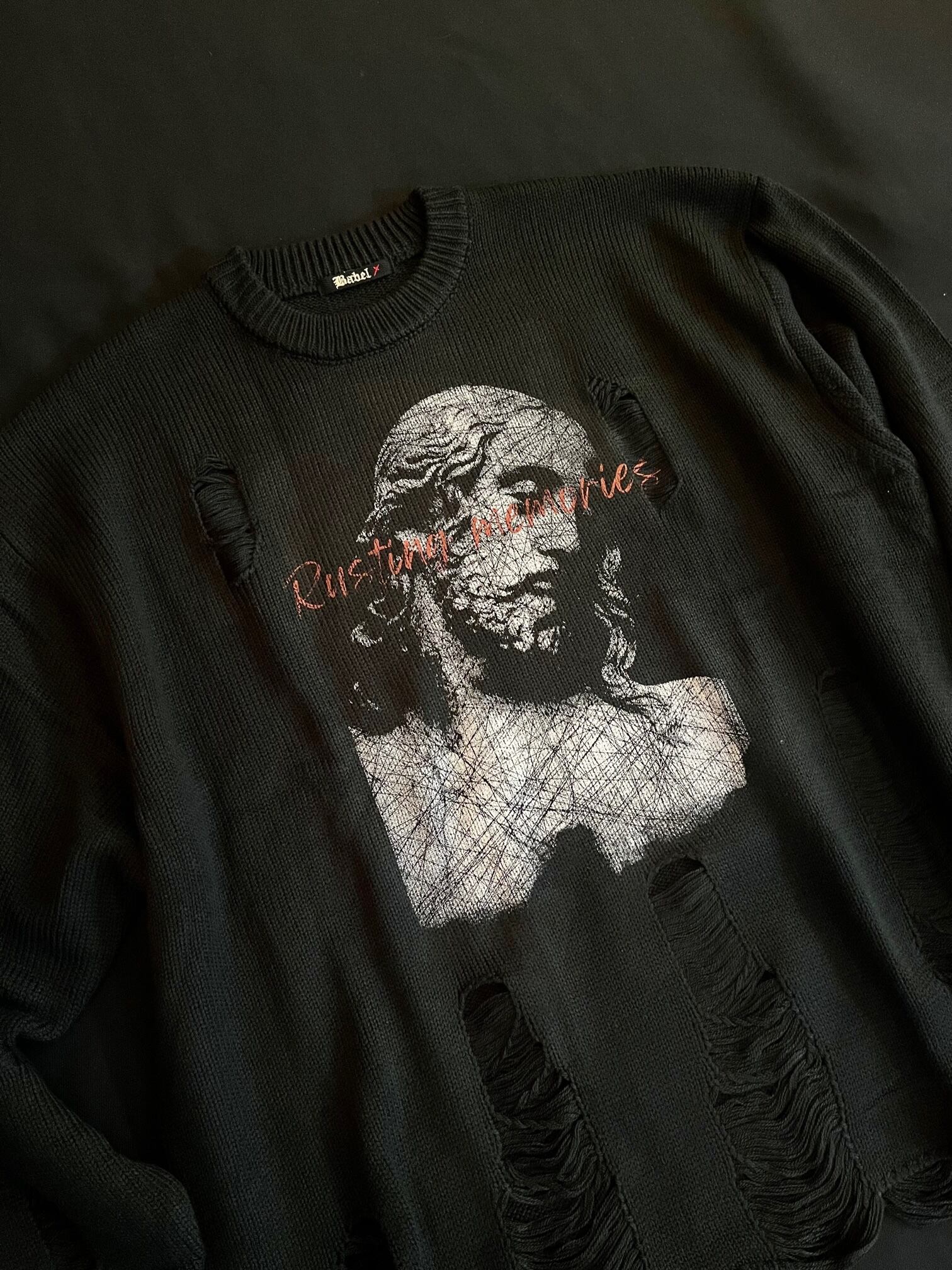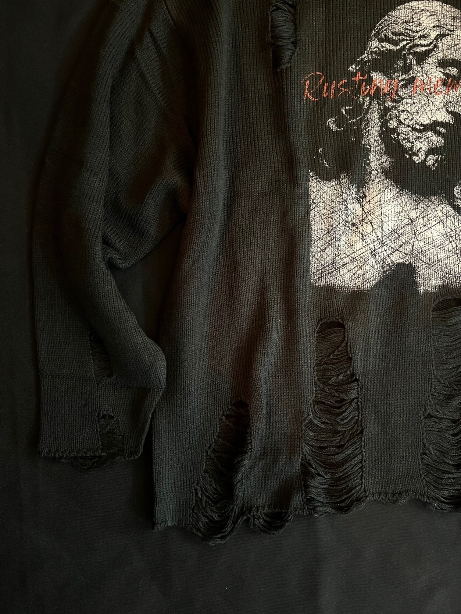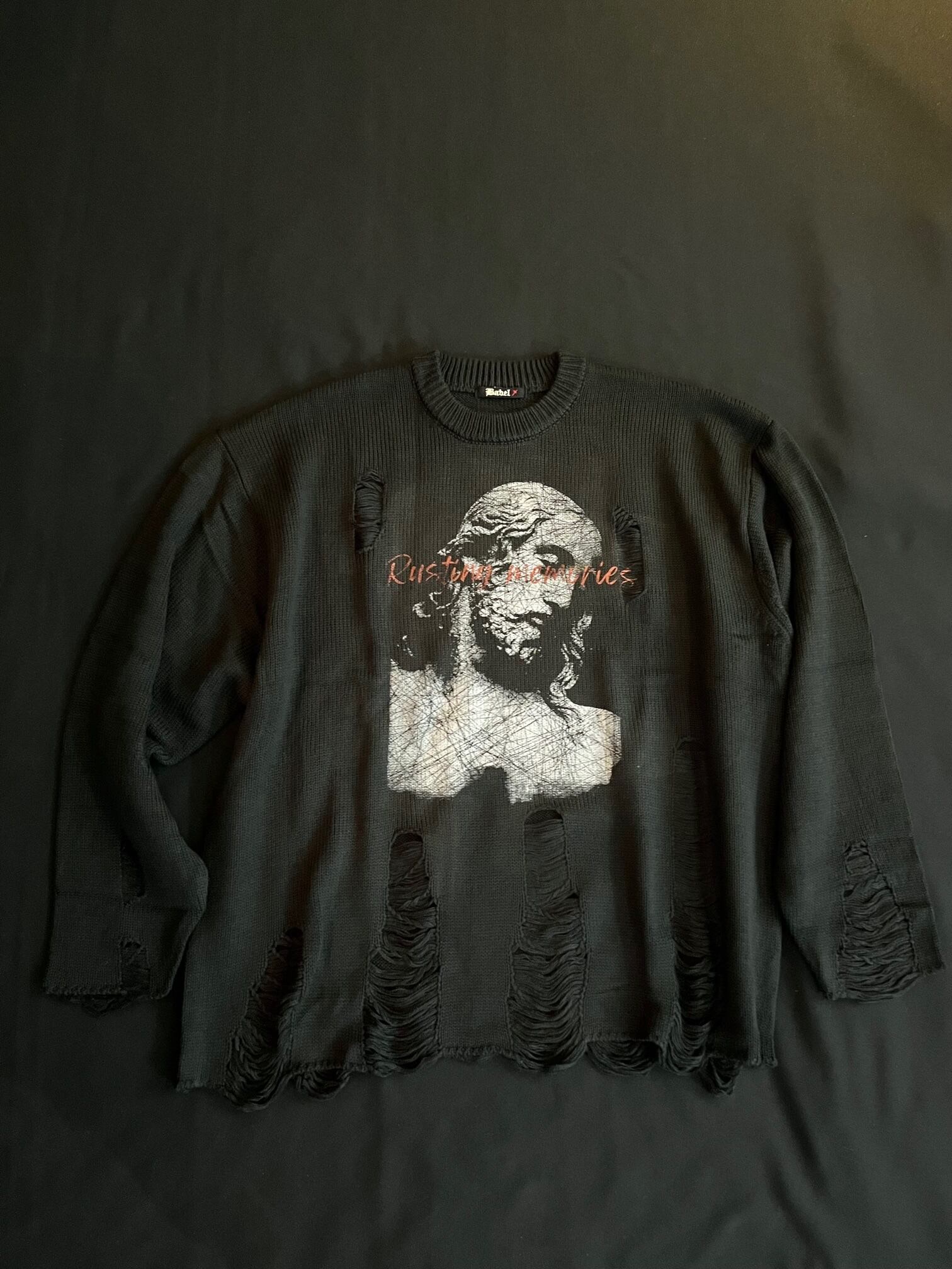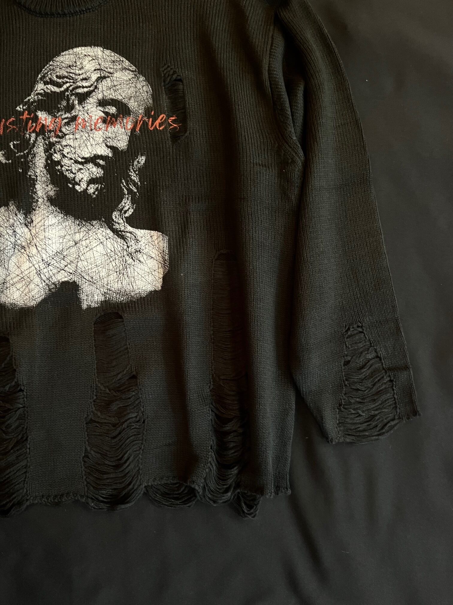 大胆にダメージ加工が施されたクルーネックニットに、BABELオーナー兼ディレクターYamagata氏とアーティスト近藤崇氏,両氏の監修によるアートワークを施したスペシャルエディション。1枚づつ、手作業によるシルクスクリーンで異なるグラフィックを施しており、すべて1点物となります。